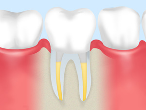 神経までむし歯が進行した状態。熱いものがしみるようになるほか、何もしていなくてもズキズキと激しく痛むようになります。 | 神経を除去し、神経が入っていた管(根管)の内部を消毒して薬剤を詰める根管治療を行い、クラウン(被せ物)を被せます。 |