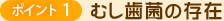 お口の中に棲息する多くの細菌のうち、「ミュータンス菌」という細菌がむし歯の原因菌です。生まれたての赤ちゃんのお口の中には、ミュータンス菌は存在しません。生活の中で、いつの間にか感染していることがほとんどです。 |